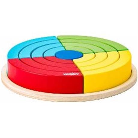 Kostky. WOODY Skládací duhové kruhy. . Dřevěná skládačka pro nejmenší. Dítě skládá z duhových částí oblouků kola. Ty pak skládá od středu od nejmenších po největší. Pokud vše správně poskládá, bude výsledkem kruh skládající se ze čtvrtin 4 různých barev. Součástí výrobku je dřevěná podložka jako základna. Podporuje rozvoj jemné motoriky, logiky a kombinatoriky. . 17 kostek. . Věk 3+. Rozměry (VxŠxH) 2 x 17,5 x 17,5 cm
