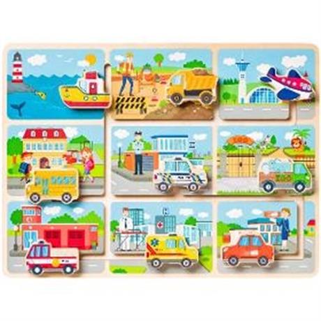 Motorická hračka. WOODY Kam jede autíčko. . Úkolem dítěte je umístit dopravní prostředky do prostředí, do kterých patří. Loď na moře, hasičské auto před hasičskou stanici, nákladní auto na staveniště atd.. Cestou se musí vyhýbat ostatním autíčkům a najít si tu správnou cestu ke svému cíli. . Věk 11+. Rozměry (VxŠxH) 22 x 30 x 2,3 cm