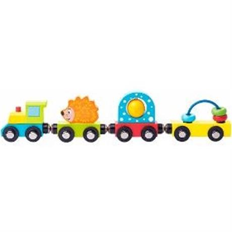 Vláček. WOODY Vláček s ježkem a hračkami. . Vláček do vláčkodráhy. Pro nejmenší děti. Obsahuje figurku ježečka a další zábavné hrací elementy: korálky na drátku a otáčecí kuličku. . Věk 2+. Rozměr 6 x 27,5 cm