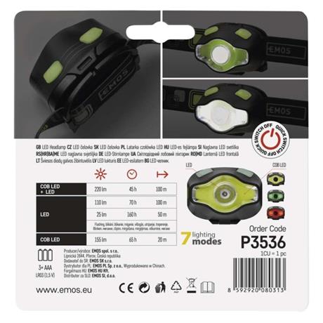 barva: černá|baterie součástí balení: ne|doba nabíjení: neuvádí se|doba svícení: 45–160 h|doba svícení detail: COB LED + LED 100 % – 45 h, LED 100 % – 70 h, LED 50 % – 160 h, COB LED 100 % – 65 h|dosvit: COB LED + LED 100 % – 100 m, LED 100 % – 100 m, LED 50 % – 50 m, COB LED 100 % – 20 m|fokus: ne|hmotnost: 65 g/100 g|LED indikace nabíjení: neuvádí se|LED indikace stavu akumulátoru: neuvádí se|materiál: ABS plast|maximální dosvit: 100 m|maximální světelný tok: 220 lm|nabíjecí: ne|napájení: 3× AAA|nárazuvzdornost: ano|počet režimů svícení: 7|příslušenství: neuvádí se|prodejní obal: 1 ks, papírový blistr|reflexní pásek: ano|režimy svícení: COB LED + LED 100 %, LED 100 %, LED 50 %, blikání, COB LED – bílá, COB LED – červená, COB LED – zelená|rozměr: 65 × 45 × 50 mm|speciální funkce: rychlé vypnutí|světelný tok: COB LED + LED 100 % – 220 lm, LED 100 % – 110 lm, LED 50 % – 25 lm, COB LED 100 % – 155 lm|typ baterie: LR03 (1,5 V)|typ napájecího konektoru: neuvádí se|úhel vyzařování: 15°/12