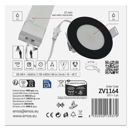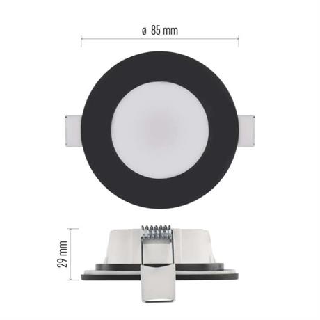 barva světla: teplá/neutrální bílá|barva těla: černá|dálkový ovladač: ne|další funkce: –|do chodby a na schodiště: ano|do dílny a garáže: ne|do kanceláře: ne|do koupelny: ano|do kuchyně: ano|do obýváku, ložnice a dětského pokoje: ano|dosah senzoru: neuvádí se|flicker-free: ano|frekvence: 50/60 Hz|index podání barev (CRI): Ra > 80|jazyky aplikace: –|kategorie: PROFI|kompatibilita: –|krytí: IP65|materiál difuzoru: plast (PC)|materiál LGP: neuvádí se|materiál těla: plast|montážní otvor: 72 mm|možnost stmívání: ne|náhrada za žárovku: 30 W|napětí: 220–240 V~|na zahradu a balkon: ano|notifikace do mobilní aplikace: ne|obsah balení: –|ovládání hlasovými asistenty: ne|podporované OS: –|pohybový senzor: ne|přenosová frekvence: –|příkon: 4,5 W|prodejní obal: 1 ks, krabice|protokol: –|proud: 36 mA|řada: –|rozměr: průměr 85 × 29 mm|světelná účinnost: 77 lm/W|světelný tok: 345 lm|teplota chromatičnosti: 2 700/4 000 K|tvar: kruh|typ difuzoru: mléčný|typ svítidla: bodovka|účiník: > 0,5|UGR<: neuvád