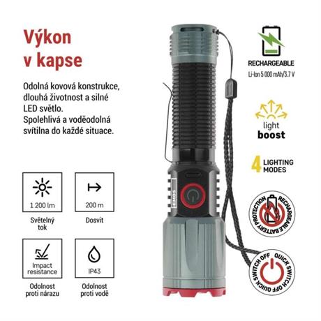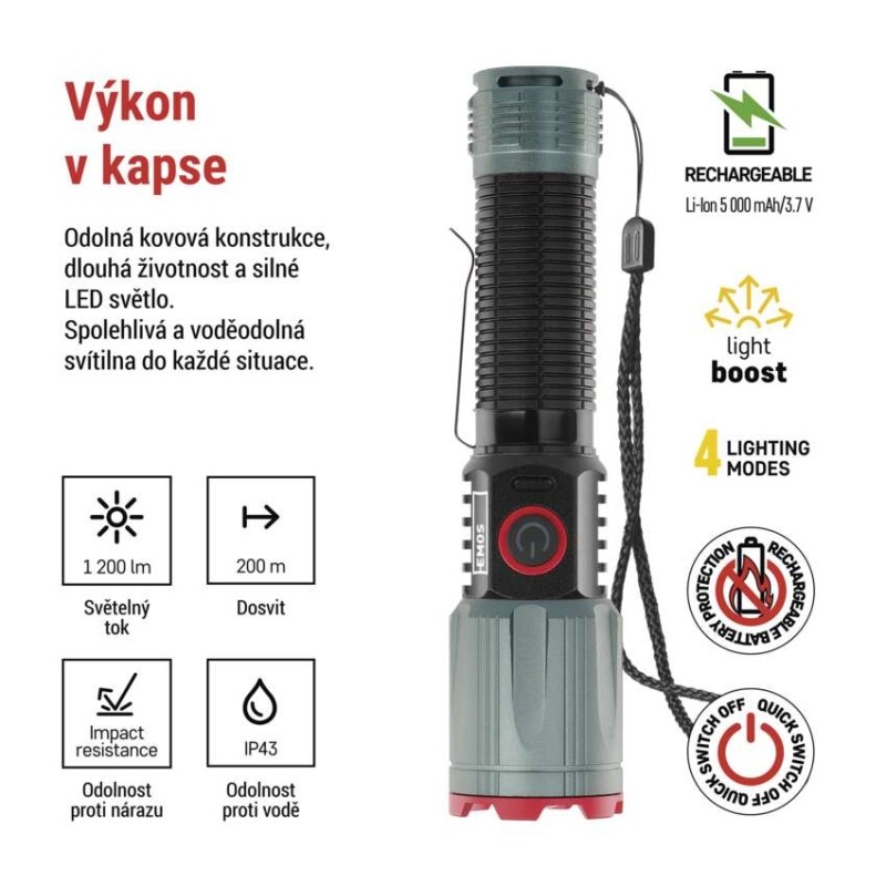 barva: černá, metalická šedá|baterie součástí balení: ano|doba nabíjení: 4,5 h|doba svícení: 4–22 h|doba svícení detail: LED BOOST – 1 min, LED 100 % – 4 h, LED 50 % – 8 h, LED 10 % – 22 h|dosvit: LED BOOST – 200 m, LED 100 % – 140 m, LED 50 % – 100 m, LED 10 % – 50 m|fokus: ano|hmotnost: 168 g|LED indikace nabíjení: ano|LED indikace stavu akumulátoru: ano|materiál: hliník|maximální dosvit: 200 m|maximální světelný tok: 1 200 lm|nabíjecí: ano|napájení: Li-Ion 18650|nárazuvzdornost: ano|počet režimů svícení: 4|příslušenství: neuvádí se|prodejní obal: 1 ks, krabice|režimy svícení: LED BOOST, LED 100 %, LED 50 %, LED 10 %|rozměr: 150 × 35 × 35 mm|speciální funkce: funkce rychlého vypnutí, funkce ochrany baterie, funkce powerbank|světelný tok: LED BOOST – 1 200 lm, LED 100 % – 550 lm, LED 50 % – 300 lm, LED 10 % – 60 lm|typ baterie: 2 200 mAh/3,7 V|typ napájecího konektoru: USB-C|voděodolnost: ano (IP43)|vybavení: klip, magnet, poutko|záruční doba: 2 roky|zdroj světla: LED|značka: EMOS