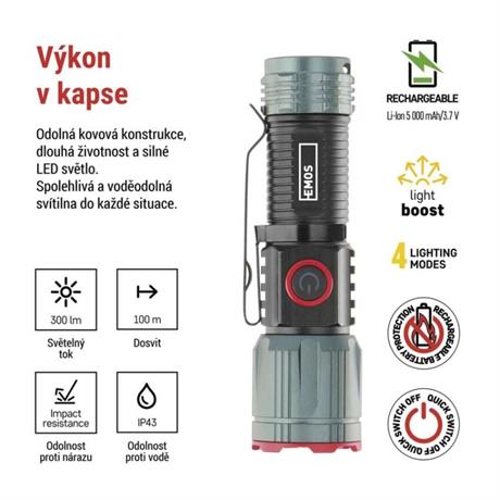 EMOS LED nabíjecí kovová svítilna 300 lm, 700 mAh