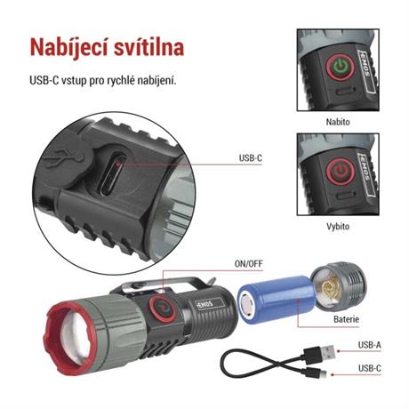 barva: černá, metalická šedá|baterie součástí balení: ano|doba nabíjení: 2,5 h|doba svícení: 3–18 h|doba svícení detail: LED BOOST – 1 min, LED 100 % – 3 h, LED 50 % – 3,5 h, LED 10 % – 18 h|dosvit: LED BOOST – 100 m, LED 100 % – 80 m, LED 50 % – 60 m, LED 10 % – 30 m|fokus: ano|hmotnost: 63 g|LED indikace nabíjení: ano|LED indikace stavu akumulátoru: ano|materiál: hliník|maximální dosvit: 100 m|maximální světelný tok: 300 lm|nabíjecí: ano|napájení: Li-Ion 16340|nárazuvzdornost: ano|počet režimů svícení: 4|příslušenství: neuvádí se|prodejní obal: 1 ks, krabice|režimy svícení: LED BOOST, LED 100 %, LED 50 %, LED 10 %|rozměr: 90 × 25 × 25 mm|speciální funkce: funkce rychlého vypnutí, funkce ochrany baterie|světelný tok: LED BOOST – 300 lm, LED 100 % – 160 lm, LED 50 % – 100 lm, LED 10 % – 15 lm|typ baterie: 700 mAh/3,7 V|typ napájecího konektoru: USB-C|voděodolnost: ano (IP43)|vybavení: klip, magnet, poutko|záruční doba: 2 roky|zdroj světla: LED|značka: EMOS