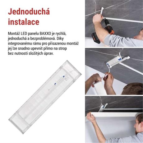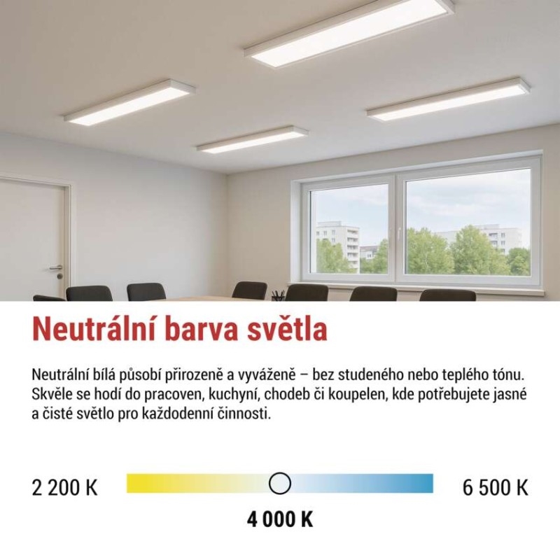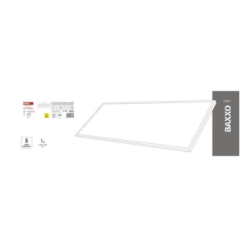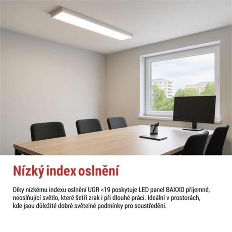 barva světla: neutrální bílá|barva těla: bílá|dálkový ovladač: ne|další funkce: –|do chodby a na schodiště: ano|do dílny a garáže: ne|do kanceláře: ano|do koupelny: ne|do kuchyně: ano|do obýváku, ložnice a dětského pokoje: ano|dosah senzoru: nemá senzor|flicker-free: ano|frekvence: 50/60 Hz|index podání barev (CRI): Ra > 80|jazyky aplikace: –|kategorie: PROFI|kompatibilita: –|krytí: IP20|materiál difuzoru: plast (PS)|materiál LGP: –|materiál těla: ocelový plech|montážní otvor: –|možnost stmívání: ne|náhrada za žárovku: 4× 18 W CFL|napětí: 220–240 V~|na zahradu a balkon: ne|notifikace do mobilní aplikace: ne|obsah balení: –|ovládání hlasovými asistenty: ne|podporované OS: –|pohybový senzor: ne|přenosová frekvence: –|příkon: 36 W|prodejní obal: 1 ks, krabice|protokol: –|proud: 170 mA|řada: BAXXO|rozměr: 1 200 × 300 × 50 mm|světelná účinnost: 120 lm/W|světelný tok: 4 320 lm|teplota chromatičnosti: 4 000 K|tvar: obdelník|typ difuzoru: mikroprizmatický|typ svítidla: panel|účiník: > 0,9|UG