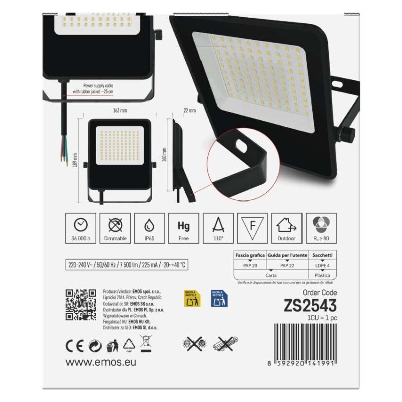 akumulátor: ne|barva: černá|barva světla: neutrální bílá|délka přívodního kabelu: 25 cm|doba svícení na AKU: neuvádí se|dosah PIR senzoru: nemá PIR|energetická třída použitého světelného zdroje: D|flicker-free: ano|frekvence: 50/60 Hz|index podání barev (CRI): Ra > 80|kategorie: CLASSIC|krytí: IP65|materiál difuzoru: sklo|materiál přívodního kabelu: guma|materiál těla: hliník|napájení: ze sítě|napětí: 220–240 V~|PIR senzor: ne|počet průchozích zásuvek: neuvádí se|použití: povrchová montáž|příkon: 50 W|prodejní obal: 1 ks, krabice|proud: 225 mA|řada: –|rozměr: 189 × 163 × 22 mm|rozsah pracovní teploty: -20 °C až +40 °C|stmívání: ne|stupeň ochrany proti mechanickým nárazům: neuvádí se|světelná účinnost: 150 lm/W|světelný tok: 7 500 lm|teplota chromatičnosti: 4 000 K|typ přívodního kabelu: H05RN-F|typ průchozích zásuvek: neuvádí se|typ stmívání: –|účiník: > 0,9|úhel vyzařování: 110°|záruční doba: 3 roky|zdroj světla: LED|životnost: 36 000 hodin|zkušební žárovka součástí balení: ne