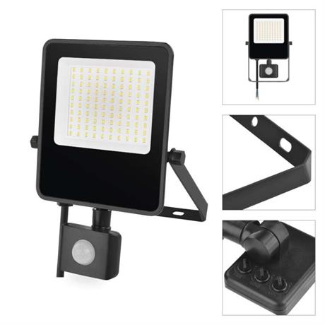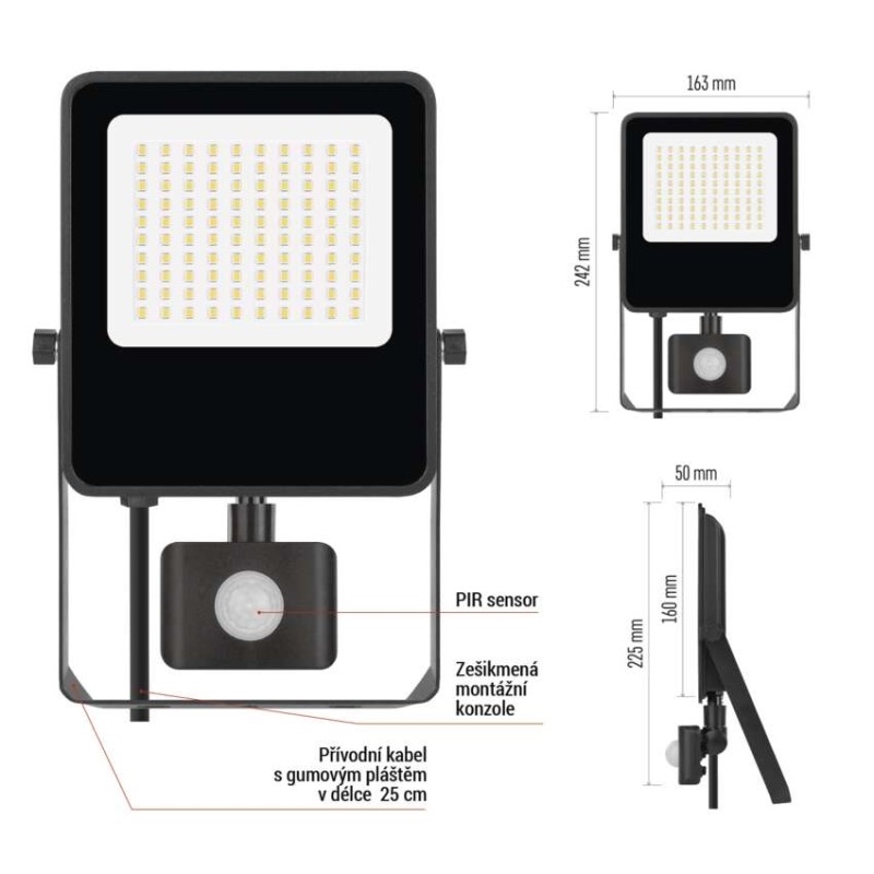 akumulátor: ne|barva: černá|barva světla: neutrální bílá|délka přívodního kabelu: 25 cm|doba svícení na AKU: neuvádí se|dosah PIR senzoru: 10 m|energetická třída použitého světelného zdroje: D|flicker-free: ano|frekvence: 50/60 Hz|index podání barev (CRI): Ra > 80|kategorie: CLASSIC|krytí: IP54|materiál difuzoru: sklo|materiál přívodního kabelu: guma|materiál těla: hliník|napájení: ze sítě|napětí: 220–240 V~|PIR senzor: ano|počet průchozích zásuvek: neuvádí se|použití: povrchová montáž|příkon: 50 W|prodejní obal: 1 ks, krabice|proud: 225 mA|řada: –|rozměr: 242 × 163 × 50 mm|rozsah pracovní teploty: -20 °C až +40 °C|stmívání: ne|stupeň ochrany proti mechanickým nárazům: neuvádí se|světelná účinnost: 150 lm/W|světelný tok: 7 500 lm|teplota chromatičnosti: 4 000 K|typ přívodního kabelu: H05RN-F|typ průchozích zásuvek: neuvádí se|typ stmívání: –|účiník: > 0,9|úhel vyzařování: 110°|záruční doba: 3 roky|zdroj světla: LED|životnost: 36 000 hodin|zkušební žárovka součástí balení: ne