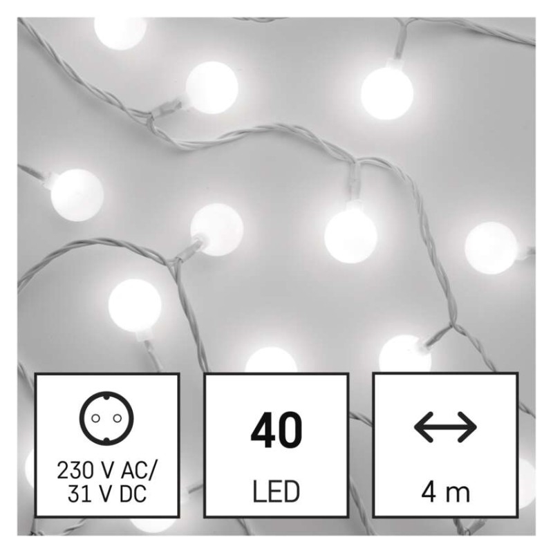 Řetězy CHERRY s velkými kuličkami nabízejí širokou škálu použití nejen při tvorbě vánoční výzdoby a atmosféry. Jejich LED světýlka jsou schovaná v kuličkách o průměru 2,5 cm, které jsou ozdobou i ve chvílích, kdy řetěz nesvítí. Na základě zvolené délky a barvy světla se postarají o ozdobení malých dekorací v interiéru, rozsvícení vánočního stromečku i většího stromu na zahradě. Skvěle se hodí pro vytvoření slavnostní atmosféry na rodinné oslavě, svatbě nebo dětské párty. Všude tam mohou během dne bílé kuličky vypnutého řetězu CHERRY sloužit jako dekorace, která se po setmění rozzáří a navodí tu pravou atmosféru. Řetězy CHERRY jsou tak doslova dva v jednom.