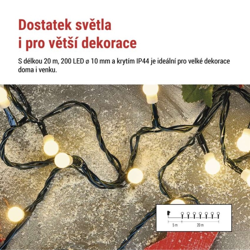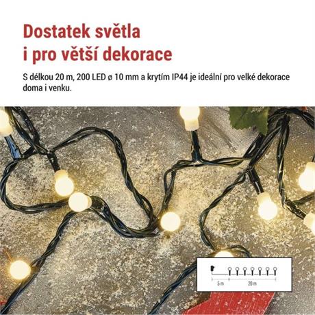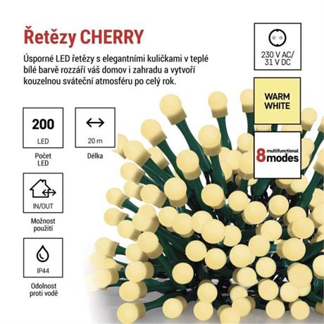 EMOS LED vánoční cherry řetěz – kuličky, 20 m, venkovní i vnitřní, teplá bílá, programy,časovač