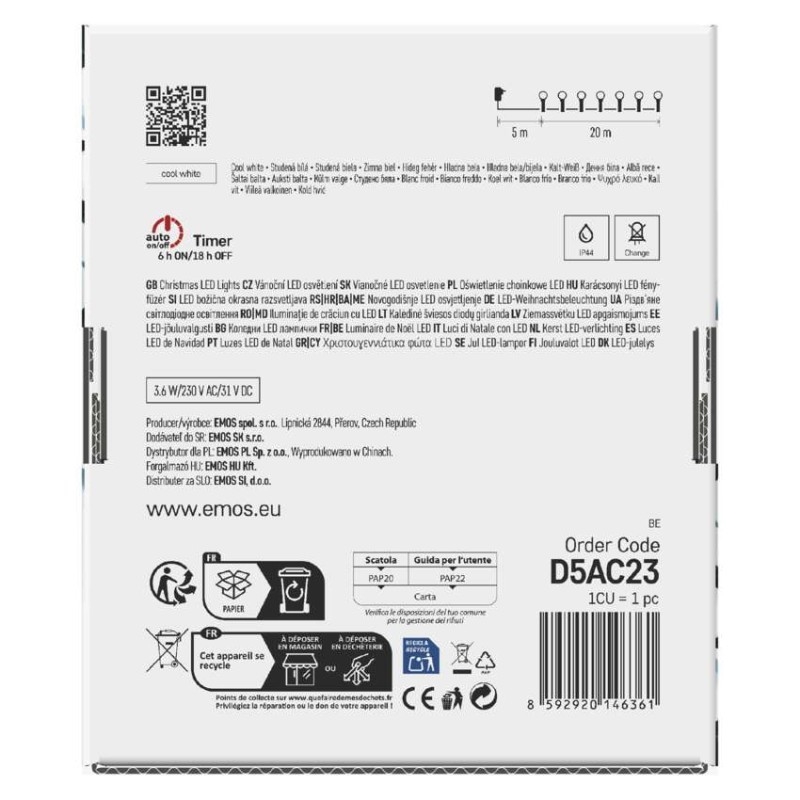 barva drátu: zelená|barva světla: studená bílá|časovač: ano|dálkový ovladač: ne|další funkce: –|délka přívodu: 5 m|funkce: 8 módů (multifunkce)|jazyky aplikace: –|kompatibilita: –|krytí: IP44|LED mezera: 10 cm|materiál: PVC|možnost propojení: ne|notifikace do mobilní aplikace: ne|ovládání hlasovými asistenty: ne|počet LED: 200|podporované OS: –|použití: venkovní i vnitřní|přenosová frekvence: –|příkon: 3,6 W|prodejní obal: 1 ks, krabice|produkt: řetěz|protokol: –|pro výšku stromu: 210 cm|rozměr: 20 m|tvar: kulička|typ napájení: síťový adaptér|velikost LED: 10 mm|vstupní napětí: 230 V AC|výstupní napětí: 31 V DC|záruční doba: 2 roky|životnost: 10 000 hodin