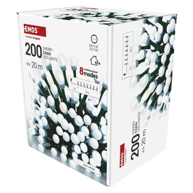 EMOS LED vánoční cherry řetěz – kuličky, 20 m, venkovní i vnitřní,studená bílá,programy,časovač