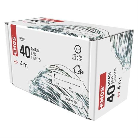 barva drátu: zelená|barva světla: studená bílá|časovač: ano|dálkový ovladač: ne|délka přívodu: 5 m|funkce: svítí|krytí: IP44|LED mezera: 10 cm|materiál: kov|možnost propojení: ne|počet LED: 40|použití: venkovní i vnitřní|příkon: 2,1 W|prodejní obal: 1 ks, krabice|produkt: nano řetěz|pro výšku stromu: 100 cm|rozměr: 4 m|tvar: nano|typ napájení: síťový adaptér|velikost LED: 3 mm (nano)|vstupní napětí: 230 V AC|výstupní napětí: 3,5 V DC|záruční doba: 2 roky|životnost: 10 000 hodin