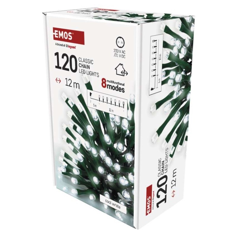 EMOS LED vánoční řetěz, 12 m, venkovní i vnitřní, studená bílá, programy, časovač