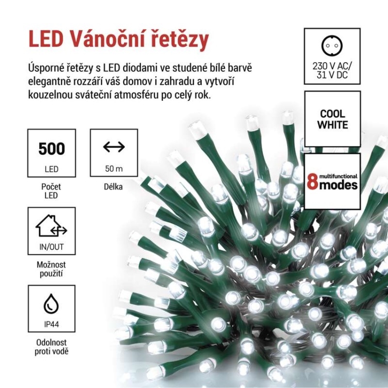 barva drátu: zelená|barva světla: studená bílá|časovač: ano|dálkový ovladač: ne|další funkce: –|délka přívodu: 5 m|funkce: 8 módů (multifunkce)|jazyky aplikace: –|kompatibilita: –|krytí: IP44|LED mezera: 10 cm|materiál: PVC|možnost propojení: ne|notifikace do mobilní aplikace: ne|ovládání hlasovými asistenty: ne|počet LED: 500|podporované OS: –|použití: venkovní i vnitřní|přenosová frekvence: –|příkon: 6 W|prodejní obal: 1 ks, krabice|produkt: řetěz|protokol: –|pro výšku stromu: 300 cm|rozměr: 50 m|tvar: klasický|typ napájení: síťový adaptér|velikost LED: 5 mm|vstupní napětí: 230 V AC|výstupní napětí: 31 V DC|záruční doba: 2 roky|životnost: 10 000 hodin