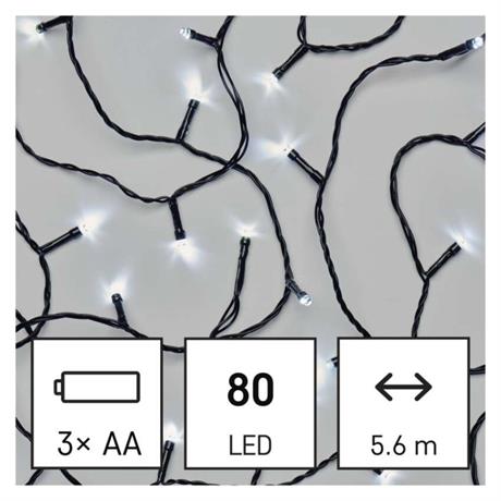 barva drátu: černá|barva světla: studená bílá|časovač: ano|dálkový ovladač: ne|délka přívodu: 0,5 m|funkce: svítí|krytí: IP44|LED mezera: neuvádí se|materiál: PVC|možnost propojení: ne|počet LED: 80|použití: venkovní i vnitřní|příkon: 0,9 W|prodejní obal: 1 ks, krabice|produkt: řetěz|pro výšku stromu: neuvádí se|rozměr: 5,6 m|tvar: neuvádí se|typ napájení: baterie 3× AA (není součástí balení)|velikost LED: neuvádí se|vstupní napětí: neuvádí se|výstupní napětí: 4,5 V DC|záruční doba: 2 roky|životnost: 10 000 hodin