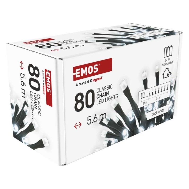 EMOS LED vánoční řetěz, 5,6 m, 3x AA, venkovní i vnitřní, studená bílá, časovač