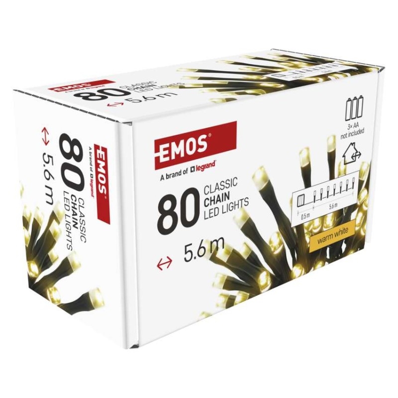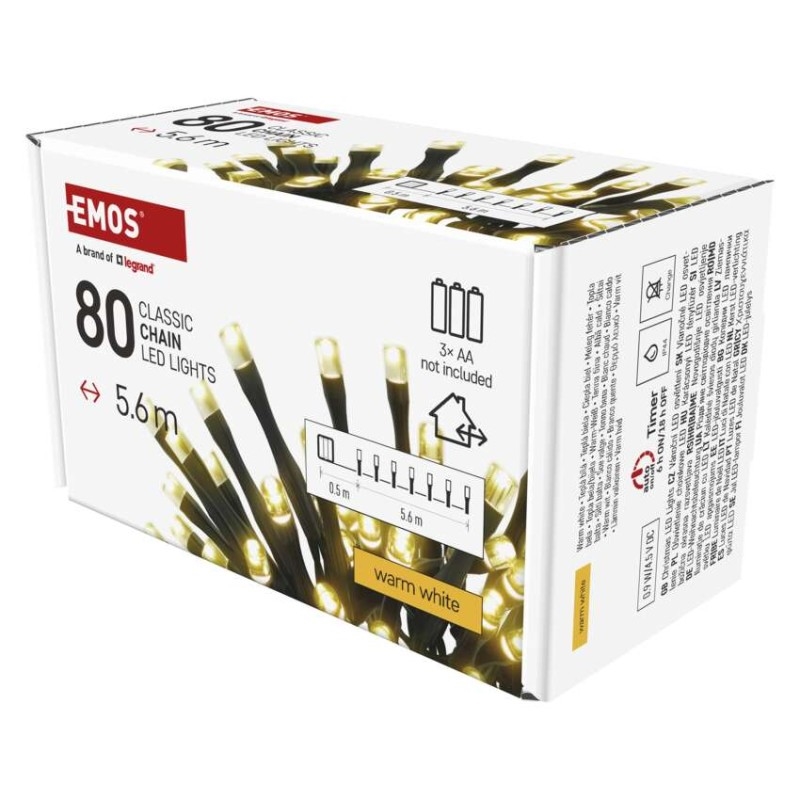 EMOS LED vánoční řetěz, 5,6 m, 3x AA, venkovní i vnitřní, teplá bílá, časovač