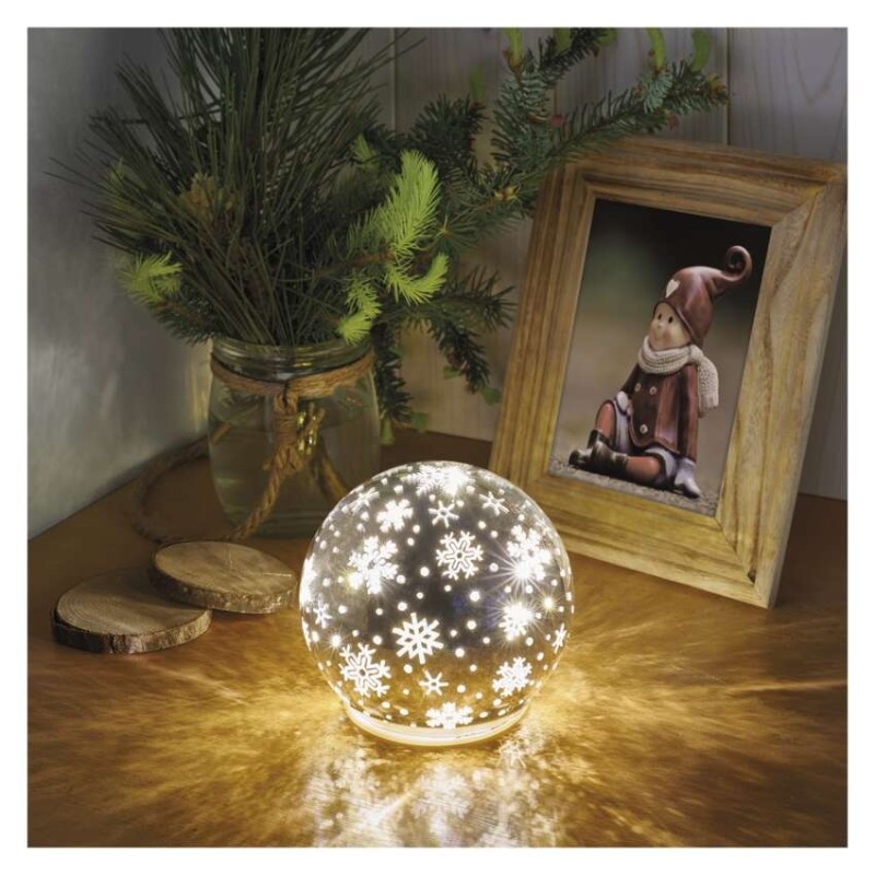 EMOS LED vánoční skleněná koule – vločky, 12 cm, 3x AA, vnitřní, teplá bílá, časovač