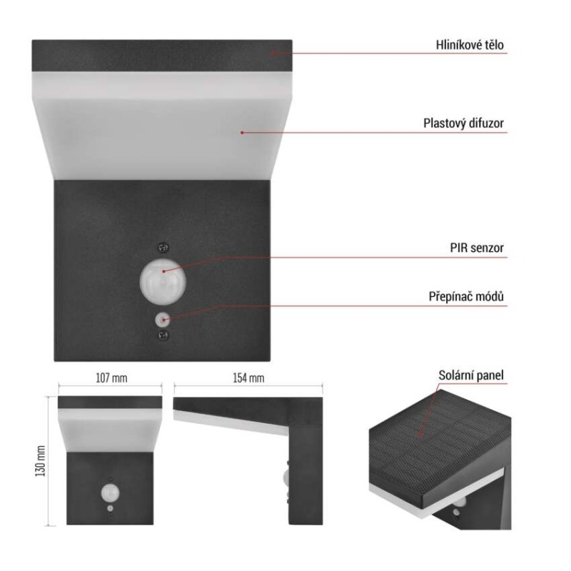 Díky solárnímu napájení je instalace extrémně jednoduchá – bez nutnosti zásahu do elektroinstalace. Stačí umístit na vhodné slunné místo a svítidlo je připraveno k provozu.