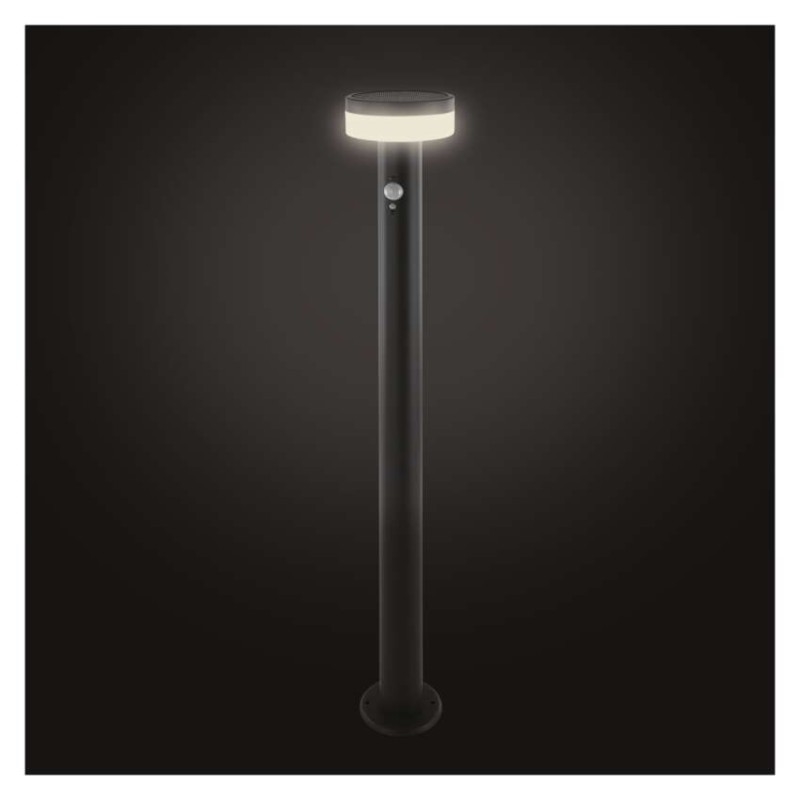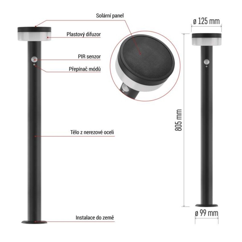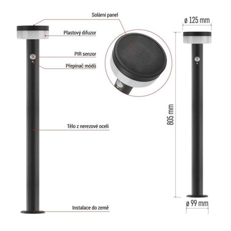barva: antracit|barva světla: teplá bílá|dosah PIR senzoru: 10 m|energetická třída použitého světelného zdroje: –|fotovoltaický článek: 0,88 W|frekvence: –|index podání barev (CRI): > 80|kategorie: CLASSIC|krytí: IP44|materiál: nerezová ocel|materiál difuzoru: plast|napájení: Li-Ion akumulátor 3,7 V/1 200 mAh|napětí: –|patice (uchycení žárovky): –|PIR senzor: ano|příkon: 2 W|prodejní obal: 1 ks, krabička|řada: TERION|rozměr: 125 × 125 × 805 mm|rozsah pracovní teploty: 0 ~ +40 °C|soumrakový spínač: ano|světelný tok: max. 200 lm|teplota chromatičnosti: 3000 K|vestavěný vypínač: ano|žárovka součástí balení: –|zdroj světla: LED|životnost: 25 000 h