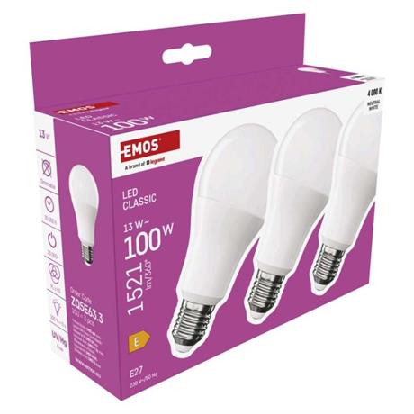 barva světla: neutrální bílá|energetická třída: E|index podání barev (CRI): 80|kompatibilita: –|náhrada za žárovku: 100 W|napětí: 230 V~/50 Hz|notifikace do mobilní aplikace: ne|ovládání hlasovými asistenty: ne|patice (uchycení žárovky): E27|počet čipů: neuvádí se|počet spínacích cyklů: 30 000|podporované OS: –|přenosová frekvence: –|příkon: 13 W|prodejní obal: 3 ks, krabička|protokol: –|řada: CLASSIC|rozměr: 60 × 60 × 120 mm|stmívatelná: ne|světelná účinnost: 117 lm/W|světelný tok: 1 521 lm|technologie: LED|teplota chromatičnosti: 4 000 K|tvar: A60|typ čipů: SMD|účiník: 0,50|úhel vyzařování: 180°|záruční doba: 3 roky|životnost: 30 000 hodin