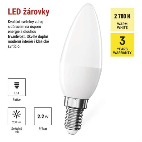 barva světla: teplá bílá|energetická třída: E|index podání barev (CRI): 80|kompatibilita: –|náhrada za žárovku: 25 W|napětí: 220-240 V~|notifikace do mobilní aplikace: –|ovládání hlasovými asistenty: –|patice (uchycení žárovky): E14|počet čipů: –|počet spínacích cyklů: 30 000|podporované OS: –|přenosová frekvence: –|příkon: 2,2 W|prodejní obal: 1 ks, krabička|protokol: –|řada: CLASSIC|rozměr: 37 × 37 × 93 mm|stmívatelná: ne|světelná účinnost: 114 lm/W|světelný tok: 250 lm|technologie: LED|teplota chromatičnosti: 2 700 K|tvar: svíčka|typ čipů: SMD|účiník: 0,50|úhel vyzařování: 240°|záruční doba: 3 roky|životnost: 30 000 hodin