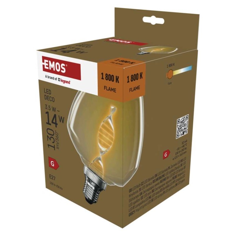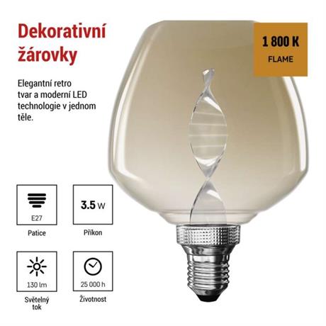 barva světla: Flame|energetická třída: G|frekvence: 50/60 Hz|index podání barev (CRI): 80|kompatibilita: –|náhrada za žárovku: 14 W|napětí: 220-240 V~|notifikace do mobilní aplikace: –|ovládání hlasovými asistenty: –|patice (uchycení žárovky): E27|počet čipů: –|počet spínacích cyklů: 25 000|podporované OS: –|přenosová frekvence: –|příkon: 3,5 W|prodejní obal: 1 ks, krabička|protokol: –|řada: DECO|rozměr: 123 × 123 × 163 mm|stmívatelná: ne|světelná účinnost: 37 lm/W|světelný tok: 130 lm|technologie: LED|teplota chromatičnosti: 1 800 K|tvar: S123|typ čipů: COB|účiník: 0,40|úhel vyzařování: 330°|záruční doba: 2 roky|životnost: 25 000 hodin