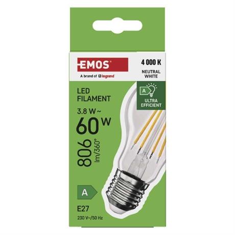 EMOS LED žárovka Filament A60 A CLASS/ E27 / 3,8 W (60 W) / 806 lm / neutrální bílá