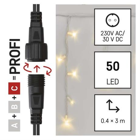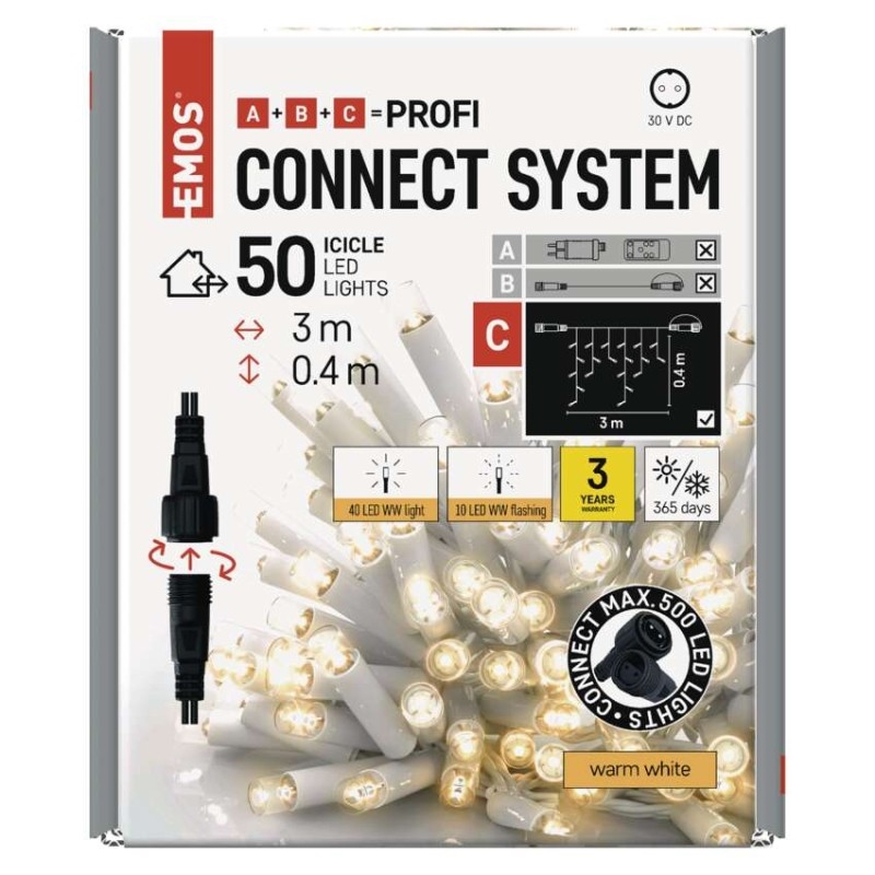 Světelné LED krápníky (rampouchy) CONNECT SYSTEM PROFI jsou dispozici v délce 3 m a výšce 0,4 m. Hledáte-li barvu, která bude nejlépe ladit s exteriérem či interiérem vašeho domu, můžete vybírat z teplé bílé, studené bílé nebo barevných kombinací s více barvami LED světýlek na jednom řetězu.