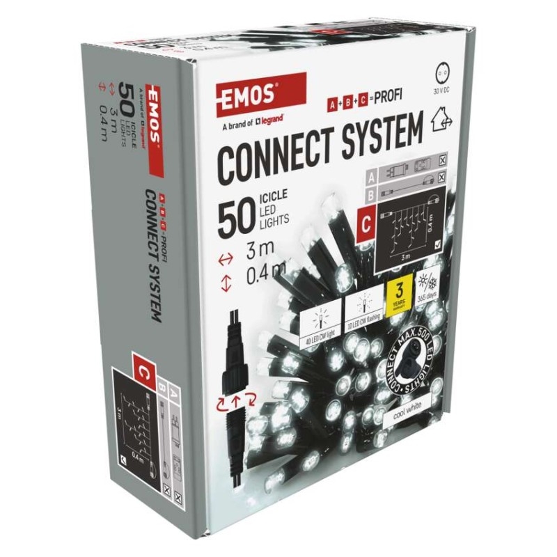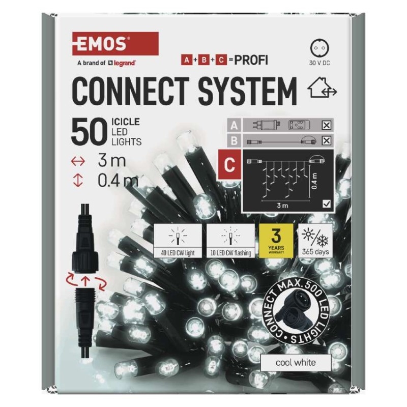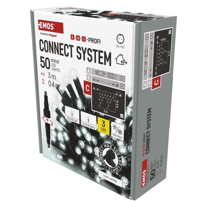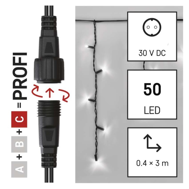 Světelné LED krápníky (rampouchy) CONNECT SYSTEM PROFI jsou dispozici v délce 3 m a výšce 0,4 m. Hledáte-li barvu, která bude nejlépe ladit s exteriérem či interiérem vašeho domu, můžete vybírat z teplé bílé, studené bílé nebo barevných kombinací s více barvami LED světýlek na jednom řetězu.