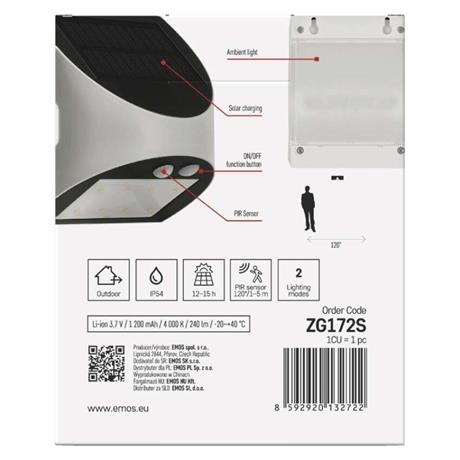 akumulátor: Li-Ion 1 200 mAh|barva: bílá|barva světla: neutrální bílá|délka přívodního kabelu: neuvádí se|doba svícení na AKU: 10 hodin|dosah PIR senzoru: 5 m|energetická třída použitého světelného zdroje: neuvádí se|flicker-free: nebliká|frekvence: neuvádí se|index podání barev (CRI): Ra > 80|kategorie: ESSENTIAL|krytí: IP54|materiál difuzoru: plast (PC)|materiál přívodního kabelu: neuvádí se|materiál těla: plast (ABS+PC)|napájení: solární|napětí: 3,7 V|PIR senzor: ano|počet průchozích zásuvek: neuvádí se|použití: povrchová montáž|příkon: –|prodejní obal: 1 ks, krabice|proud: neuvádí se|řada: neuvádí se|rozměr: 105 × 130 × 80 mm|rozsah pracovní teploty: -10 °C až +40 °C|stmívání: neuvádí se|stupeň ochrany proti mechanickým nárazům: neuvádí se|světelná účinnost: neuvádí se|světelný tok: 240 lm|teplota chromatičnosti: 4 000 K|typ přívodního kabelu: neuvádí se|typ průchozích zásuvek: neuvádí se|typ stmívání: –|účiník: neuvádí se|úhel vyzařování: 110°|záruční doba: 2 roky|zdroj světla: