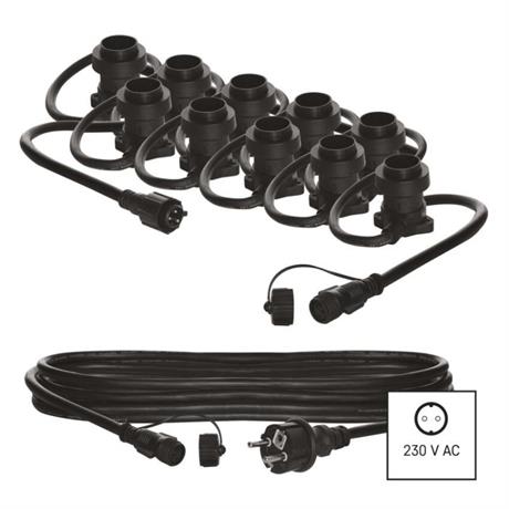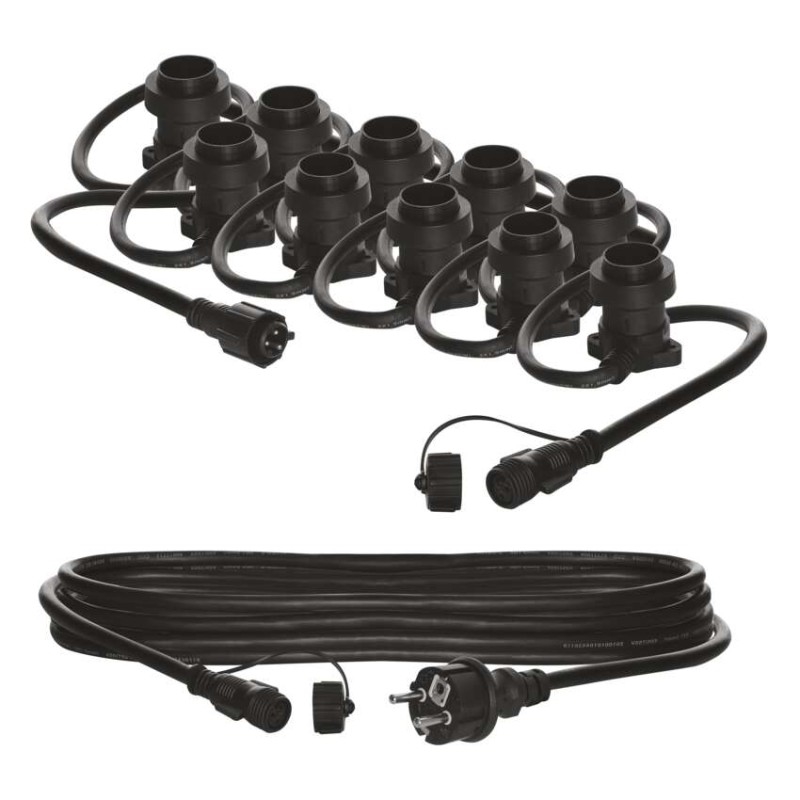 Startovací sada světelného řetězu obsahuje světelný řetěz a přívodní kabel pro připojení do elektrické zásuvky. Řetěz je vybaven paticemi E27, do kterých můžete umístit žárovky libovolné barvy, tvaru a příkonu až do maximální hodnoty 750 W. Pouhou výměnou žárovek můžete doladit útulnou atmosféru na balkoně, terase, venkovních oslavách, svatbách, kulturních akcích apod. Propojení přívodního kabelu s řetězem nebo více přikoupenými řetězy je dílem okamžiku díky vodotěsných šroubovacím spojkám. Řetěz hravě zvládne i nepřízeň počasí – žárovková objímka je vybavena gumovým těsněním, které přilne k instalované žárovce po celém jejím obvodu a zabraňuje tak průniku vody.