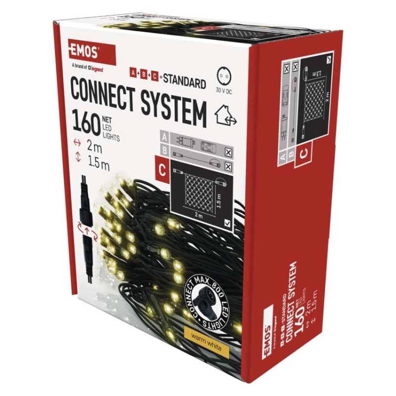 Světelné LED sítě jsou jedním z „dvojrozměrných“ řešení spojovacího osvětlení. U řetězu ve tvaru sítě jsou svěšené řetězy s LED světýlky navzájem šachovnicově propojené. Spojovací síť nejvíce vynikne na zahradních křovinách a korunách stromů. Využít je můžete i k bohatému ozdobení balkónů, střech, zdí na domě, pergol a plotů. Řetězy mezi sebou můžete vzájemně propojovat a kombinovat je s jinými LED světelnými prvky systému CONNECT SYSTEM STANDARD.