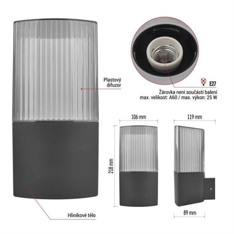 barva: antracit|barva světla: –|dosah PIR senzoru: –|energetická třída použitého světelného zdroje: –|fotovoltaický článek: ne|frekvence: 50/60 Hz|index podání barev (CRI): –|kategorie: CLASSIC|krytí: IP54|materiál: hliník|materiál difuzoru: plast|napájení: 230 V AC|napětí: 220-240 V~|patice (uchycení žárovky): E27|PIR senzor: ne|příkon: –|prodejní obal: 1 ks, krabička|řada: LANA|rozměr: 119 × 106 × 218 mm|rozsah pracovní teploty: -20 ~ +40 °C|soumrakový spínač: ne|světelný tok: –|teplota chromatičnosti: –|vestavěný vypínač: ne|žárovka součástí balení: ne|zdroj světla: –|životnost: –