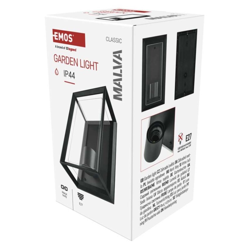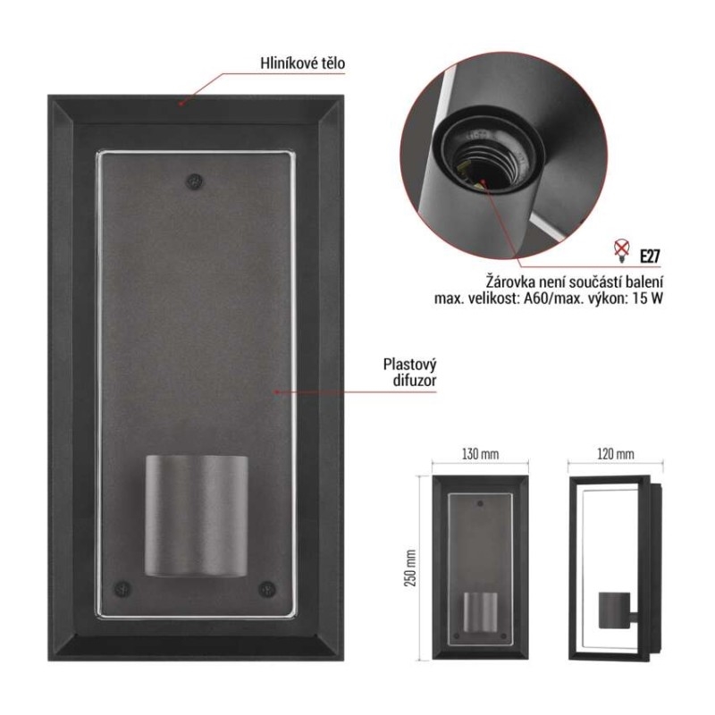 barva: černá|barva světla: –|dosah PIR senzoru: –|energetická třída použitého světelného zdroje: –|fotovoltaický článek: ne|frekvence: 50/60 Hz|index podání barev (CRI): –|kategorie: CLASSIC|krytí: IP44|materiál: hliník|materiál difuzoru: plast|napájení: 230 V AC|napětí: 220-240 V~|patice (uchycení žárovky): E27|PIR senzor: ne|příkon: –|prodejní obal: 1 ks, krabička|řada: MALVA|rozměr: 130 × 120 × 250 mm|rozsah pracovní teploty: -20 ~ +40 °C|soumrakový spínač: ne|světelný tok: –|teplota chromatičnosti: –|vestavěný vypínač: ne|žárovka součástí balení: ne|zdroj světla: –|životnost: –