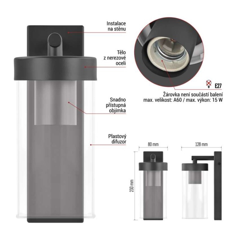 barva: antracit|barva světla: –|dosah PIR senzoru: –|energetická třída použitého světelného zdroje: –|fotovoltaický článek: ne|frekvence: 50/60 Hz|index podání barev (CRI): –|kategorie: CLASSIC|krytí: IP44|materiál: nerezová ocel|materiál difuzoru: plast|napájení: 230 V AC|napětí: 220-240 V~|patice (uchycení žárovky): E27|PIR senzor: ne|příkon: –|prodejní obal: 1 ks, krabička|řada: ZALA|rozměr: 128 × 80 × 230 mm|rozsah pracovní teploty: -20 ~ +40 °C|soumrakový spínač: ne|světelný tok: –|teplota chromatičnosti: –|vestavěný vypínač: ne|žárovka součástí balení: ne|zdroj světla: –|životnost: –