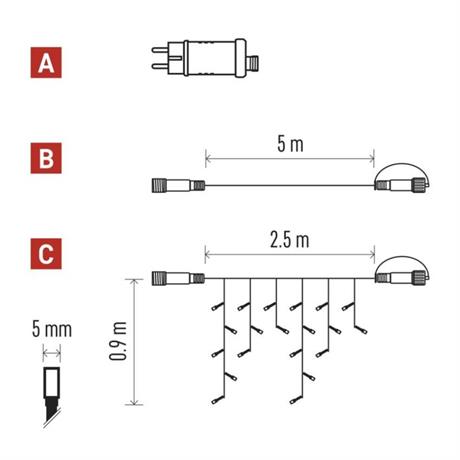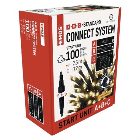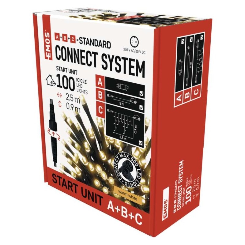 Základní sada systému CONNECT STANDARD obsahuje vše potřebné k tomu, abyste mohli ihned začít s výzdobou vašeho domu, zahrady nebo interiéru. V jednom balení naleznete tři základní komponenty systému nutné pro jeho provoz – napájecí zdroj s časovačem (A), prodlužovací kabel o délce 5 m (B) a vánoční krápníky (rampouchy) o délce 2,5 m se 100 LED diodami (C).