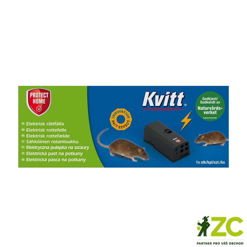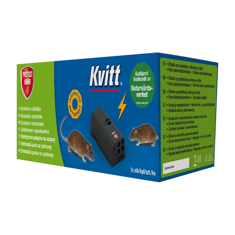 Elektrická past na krysy Kvitt je velmi účinný a rychlý způsob kontroly potkanů. Krysy jsou do pasti přilákány pomocí vložené návnady. Když se krysa dotkne kovové desky uvnitř, je usmrcena elektrickým proudem. Potkani rychle a bezbolestně uhynou. Mrtvé hlodavce lze snadno odstranit, aniž byste se jich dotkli. Elektrická past má řadu bezpečnostních prvků pro uživatele. Past funguje jak na napájecí kabel, který je součástí balení, tak na baterie (baterie nejsou součástí balení).
