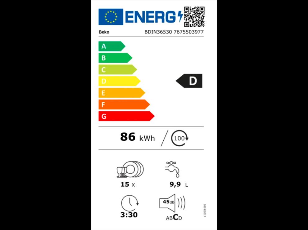 Vestavná myčka nádobí Beko Beyond BDIN36530 zvládne umýt 15 sad nádobí. Je vybavena plně integrovaným panelem a dosahuje šířky 60 cm. Oceníte praktickou příborovou zásuvku a nastavitelný koš Acrobat se 3 polohami. Během mycího cyklu uvidíte LED signalizaci na podlahu a po jeho ukončení se dvířka automaticky otevřou. Na výběr je 6 programů a 5 teplot. Vybrané nastavení je zobrazeno na LCD displeji. Funkce HygieneIntense pomocí páry odstraní viry a bakterie. Skleničky budou v té nejlepší péči díky systému GlassCare. Spotřebič je zařazen do energetické třídy D a dosahuje hlučnosti 45 dB.