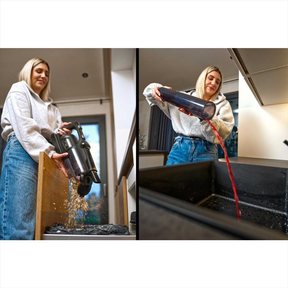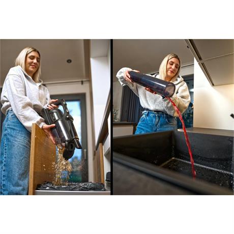 Při mokrém čištění jsou všechny nečistoty vysáty do nádoby na špinavou vodu, kterou stačí po úklidu vylít. Při suchém vysávání stačí nádobu na prach jedním dotykem otevřít a vysypat.