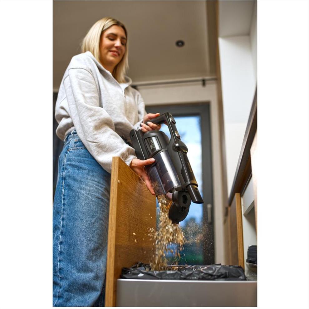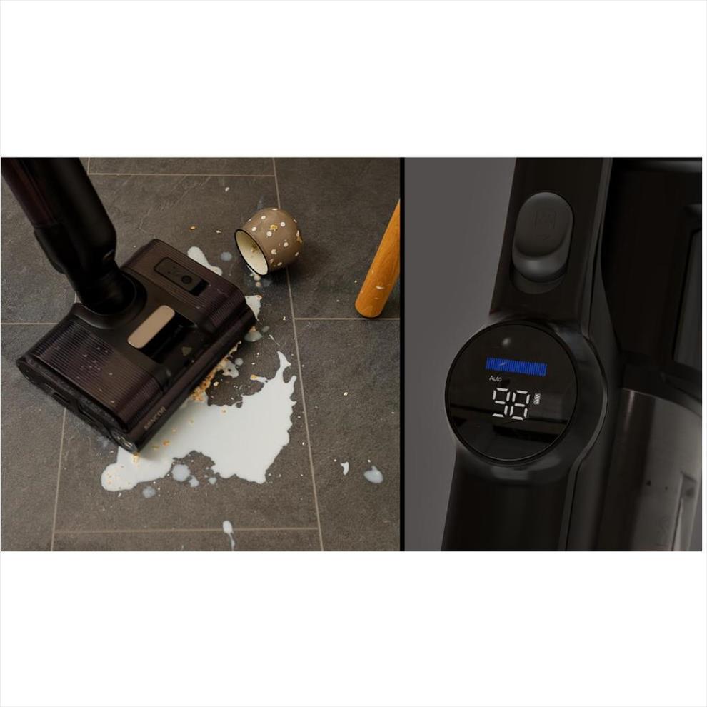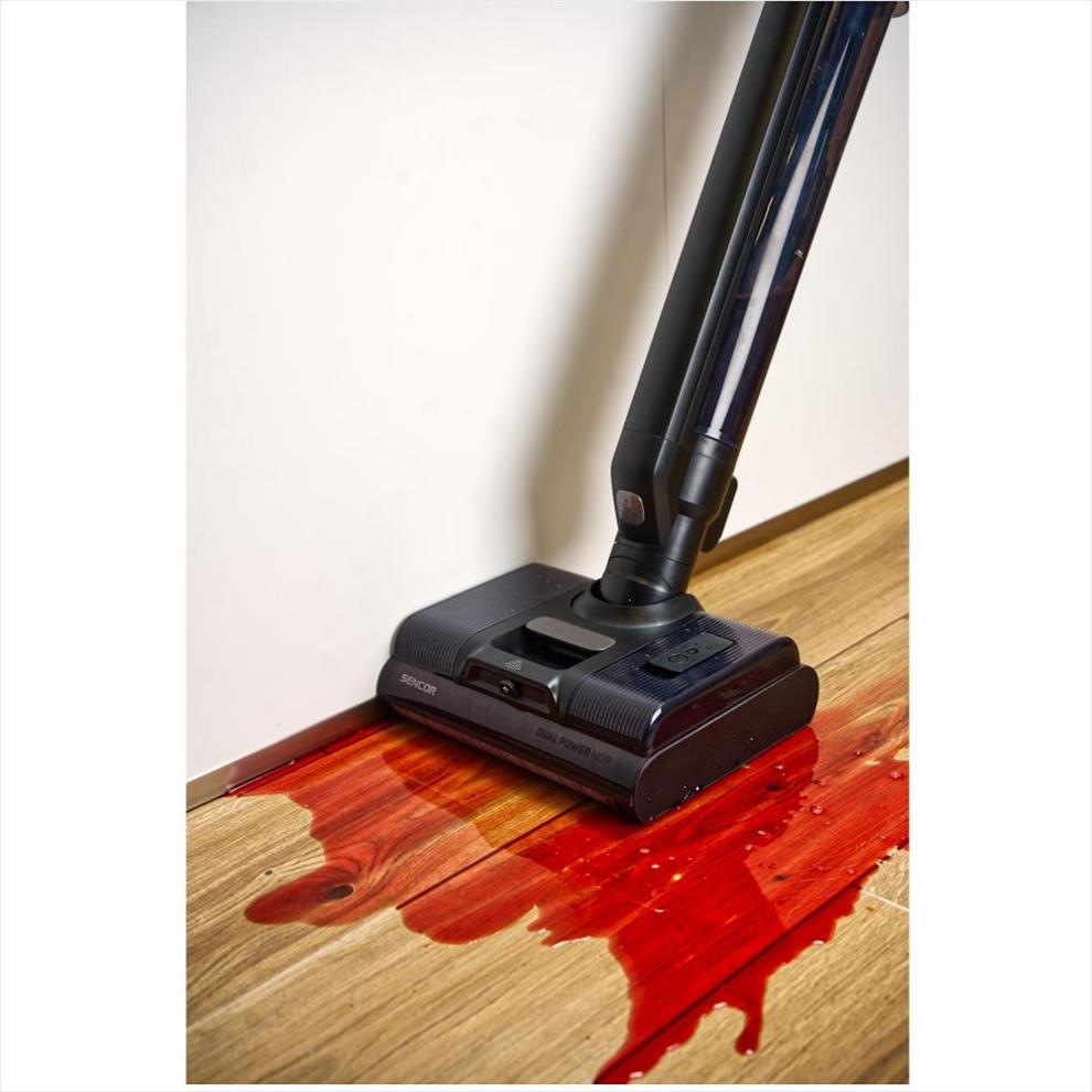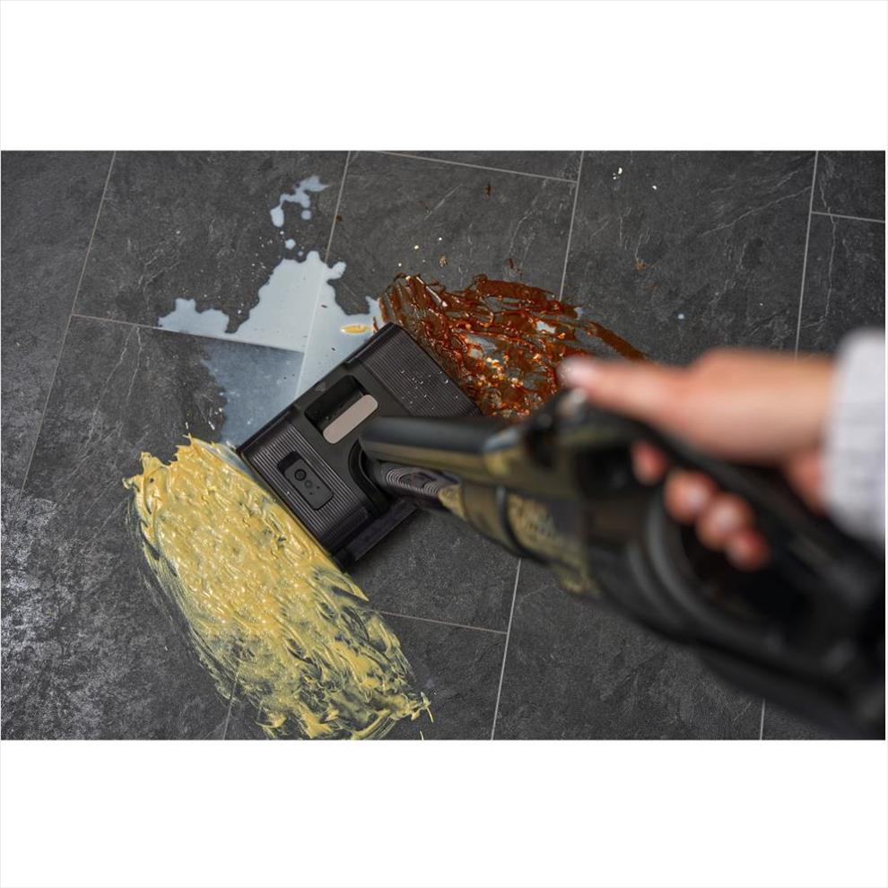 Čistič bez problému vysaje suché i mokré nečistoty. Snadno tak uklidí i vylité pití nebo převrhnuté jídlo. V režimu mokrého čištění vydrží na jedno nabití až 30 minut.