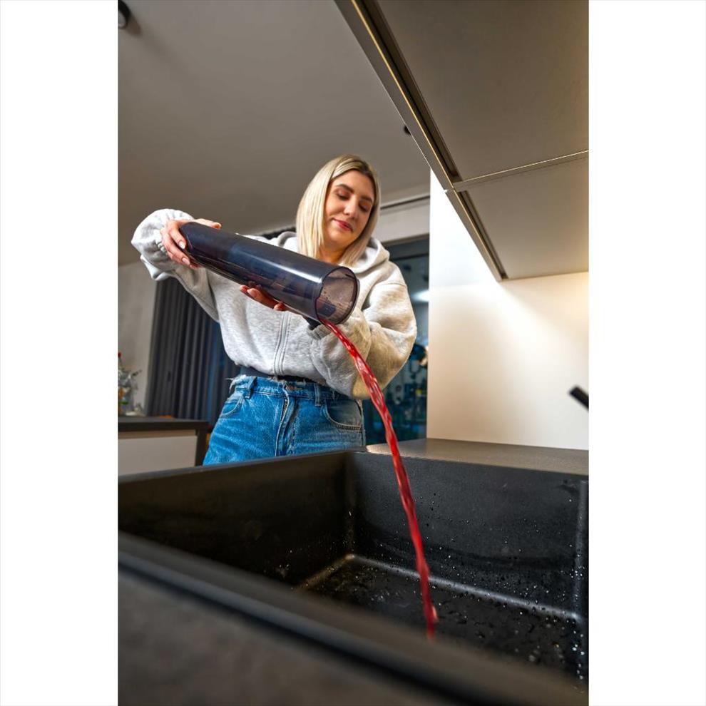 Zásluhou voděodolného motoru s výkonem 500 W jsou všechny suché i mokré nečistoty odsáty do velké nádoby o objemu 600 ml.