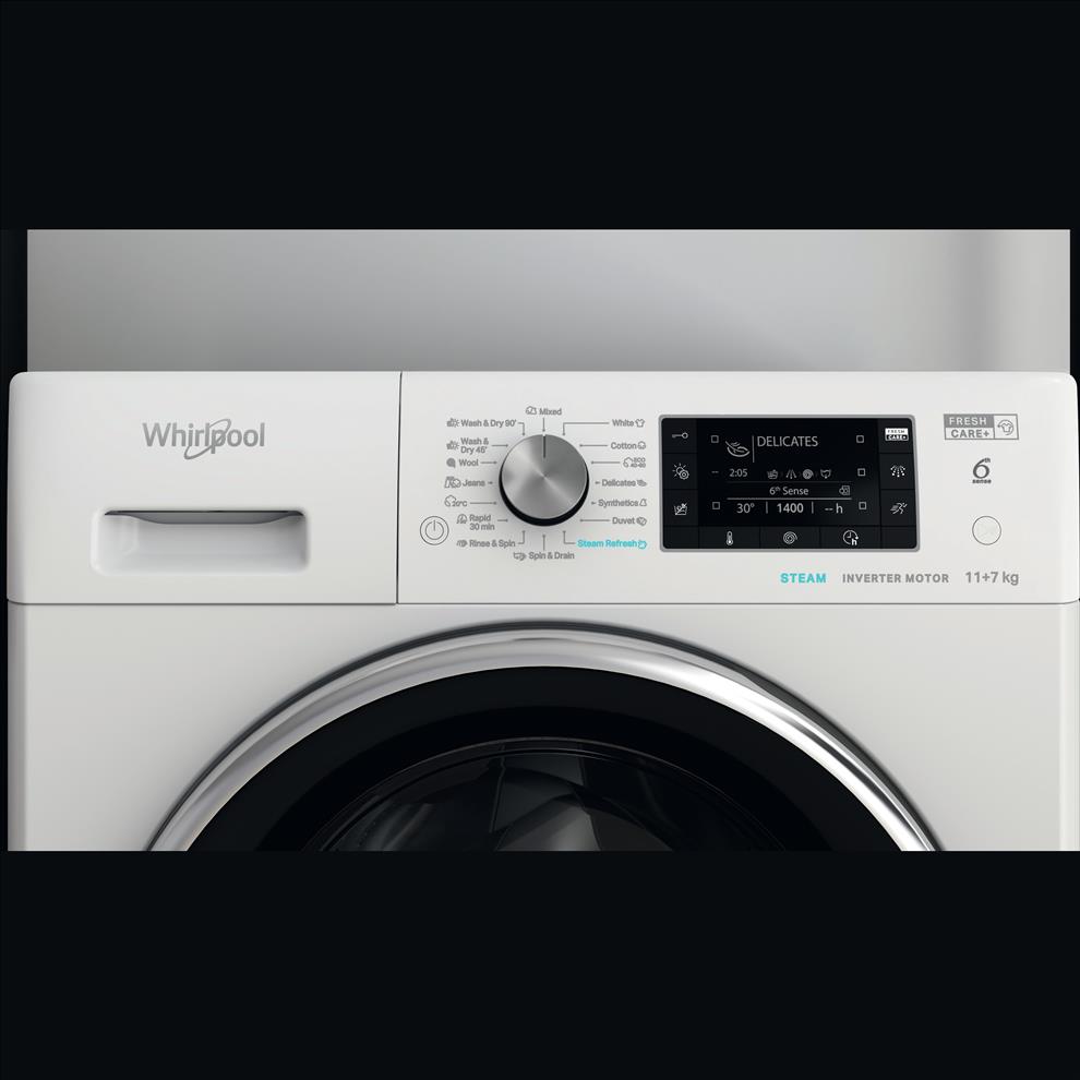 Dopřejte svému prádlu kompletní péči s kombinovanou pračkou se sušičkou FFWDD 1176258 BCV EE od Whirlpool. Díky funkci FreshCare+ na vás pokaždé počká s čerstvým a voňavým prádlem, i když jej necháte v bubnu dalších 6 hodin po skončení cyklu. Spotřebič perfektně vypere 11 kg prádla, sušicí kapacita je 7 kg.