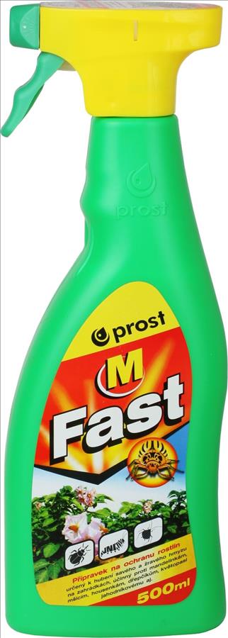 Účinná látka: Deltamethrin 0,012 g / l.Popis a působení:Fast M je insekticidní přípravek určený k hubení škodlivého savého a žravého hmyzu (mandelinka, mšice, housenka, dřepčík, květopas jahodníkový a jiný savý a žravý hmyzu) v bytech a zahradách. Je dodáván jako vodní mechanický sprej (nebo náhradní náplň) pro přímé použití. Lokálně lze ošetřovat napadené rostliny bez nutnosti spotřebování celého obsahu náplně. Přípravek lze dlouhodobě skladovat a použít k akutnímu ošetření zeleniny, jahodníku, rajčat, brambor, okrasných rostlin apod.. Použitá účinná látka ze skupiny syntetických pyrethroidů se poměrně snadno odbourává a proto jsou ochranné lhůty po ošetření krátké. Pro včely je přípravek relativně neškodný.