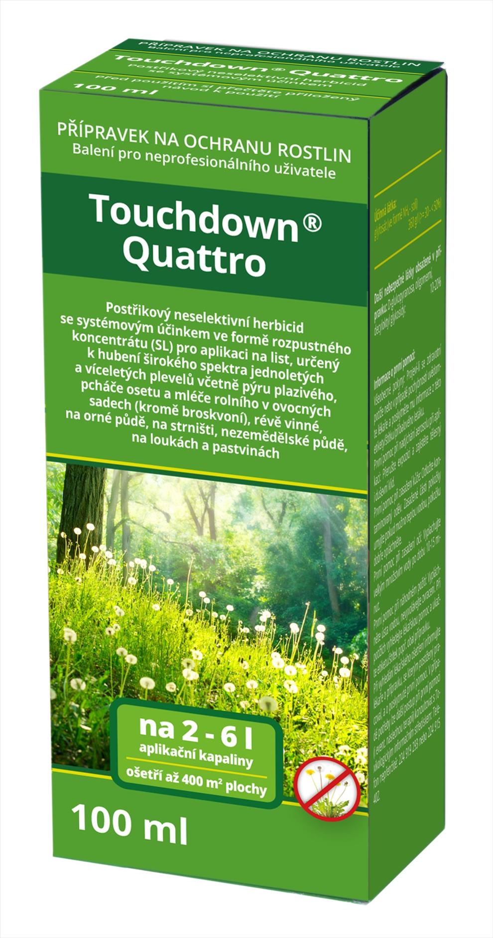 Touchdown Quattro obsahuje účinnou látku glyphosate, která je přijímaná listy. Přípravek působí neselektivně jako listový systematický herbicid proti širokému spektru jednoletých a víceletých plevelů včetně pýru plazivého, pcháče osetu a mléče rolního před setím nebo na strniště. Používá se v ovocných sadech, vinicích na orné i nezemědělské půdě.