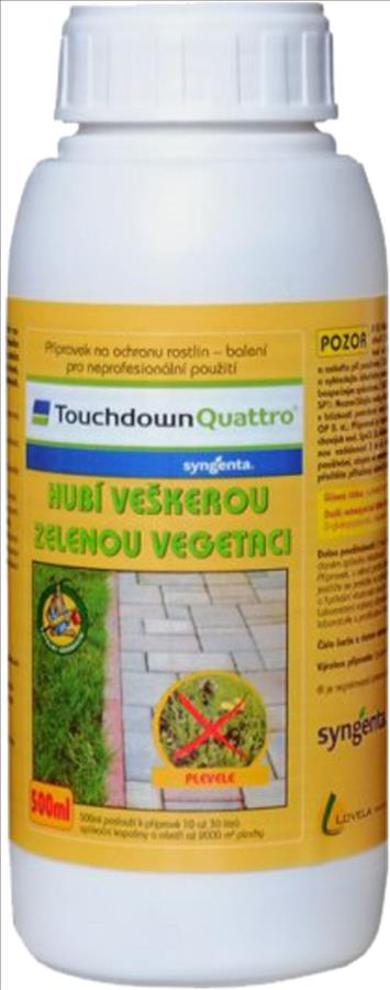 Touchdown Quattro obsahuje účinnou látku glyphosate, která je přijímaná listy. Přípravek působí neselektivně jako listový systematický herbicid proti širokému spektru jednoletých a víceletých plevelů včetně pýru plazivého, pcháče osetu a mléče rolního před setím nebo na strniště. Používá se v ovocných sadech, vinicích na orné i nezemědělské půdě.