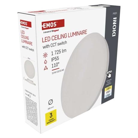 barva světla: teplá/neutrální/studená bílá|barva těla: bílá|dálkový ovladač: ne|další funkce: –|do chodby a na schodiště: ano|do dílny a garáže: ne|do kanceláře: ano|do koupelny: ano|do kuchyně: ano|do obýváku, ložnice a dětského pokoje: ano|dosah senzoru: neuvádí se|flicker-free: nebliká|frekvence: 50/60 Hz|index podání barev (CRI): Ra > 80|jazyky aplikace: –|kategorie: PROFI|kompatibilita: –|krytí: IP55|materiál difuzoru: plast|materiál LGP: neuvádí se|materiál těla: plast|montážní otvor: ne|možnost stmívání: ne|náhrada za žárovku: 110 W|napětí: 220–240 V~|na zahradu a balkon: ano|notifikace do mobilní aplikace: ne|obsah balení: –|ovládání hlasovými asistenty: ne|podporované OS: –|pohybový senzor: ne|přenosová frekvence: –|příkon: 15 W|prodejní obal: 1 ks, krabice|protokol: –|proud: 62 mA|řada: DIONI|rozměr: průměr 280 × 62 mm|světelná účinnost: 115 lm/W|světelný tok: 1 725 lm|teplota chromatičnosti: 3 000/4 000/5 700 K|tvar: kruh|typ difuzoru: mléčný|typ svítidla: klasické svítidl