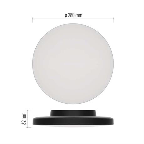 barva světla: teplá/neutrální/studená bílá|barva těla: černá|dálkový ovladač: ne|další funkce: –|do chodby a na schodiště: ano|do dílny a garáže: ne|do kanceláře: ano|do koupelny: ano|do kuchyně: ano|do obýváku, ložnice a dětského pokoje: ano|dosah senzoru: neuvádí se|flicker-free: nebliká|frekvence: 50/60 Hz|index podání barev (CRI): Ra > 80|jazyky aplikace: –|kategorie: PROFI|kompatibilita: –|krytí: IP55|materiál difuzoru: plast|materiál LGP: neuvádí se|materiál těla: plast|montážní otvor: ne|možnost stmívání: ne|náhrada za žárovku: 110 W|napětí: 220–240 V~|na zahradu a balkon: ano|notifikace do mobilní aplikace: ne|obsah balení: –|ovládání hlasovými asistenty: ne|podporované OS: –|pohybový senzor: ne|přenosová frekvence: –|příkon: 15 W|prodejní obal: 1 ks, krabice|protokol: –|proud: 62 mA|řada: DIONI|rozměr: průměr 280 × 62 mm|světelná účinnost: 115 lm/W|světelný tok: 1 725 lm|teplota chromatičnosti: 3 000/4 000/5 700 K|tvar: kruh|typ difuzoru: mléčný|typ svítidla: klasické svítid