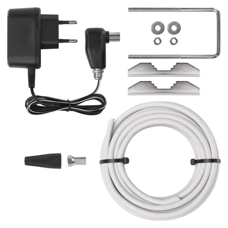 Anténa FISH–V700 obsahuje v balení vše, co budete potřebovat k její montáži na anténní stožár, držák nebo balkonové zábradlí. Montáž je velmi jednoduchá bez nutnosti použití nářadí.