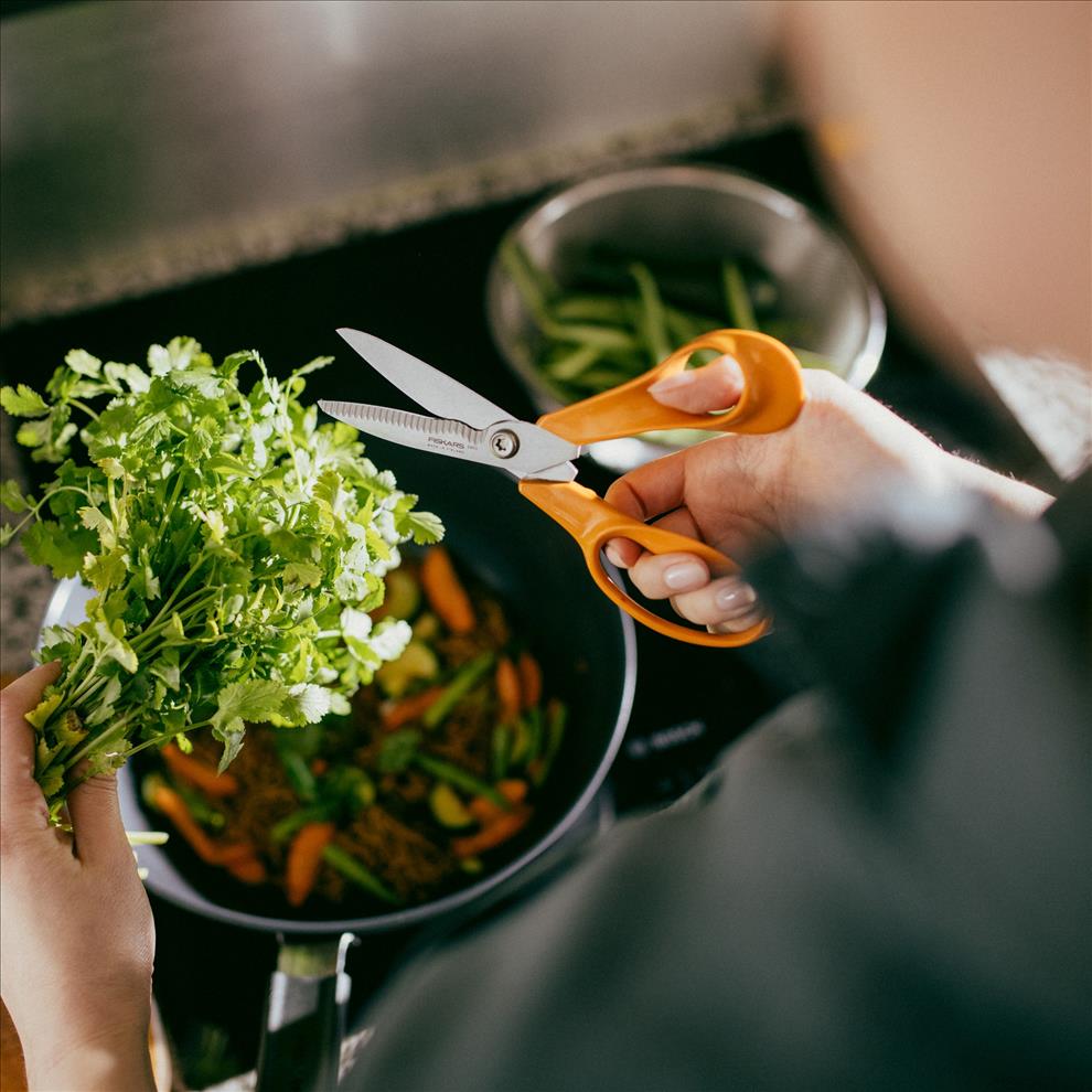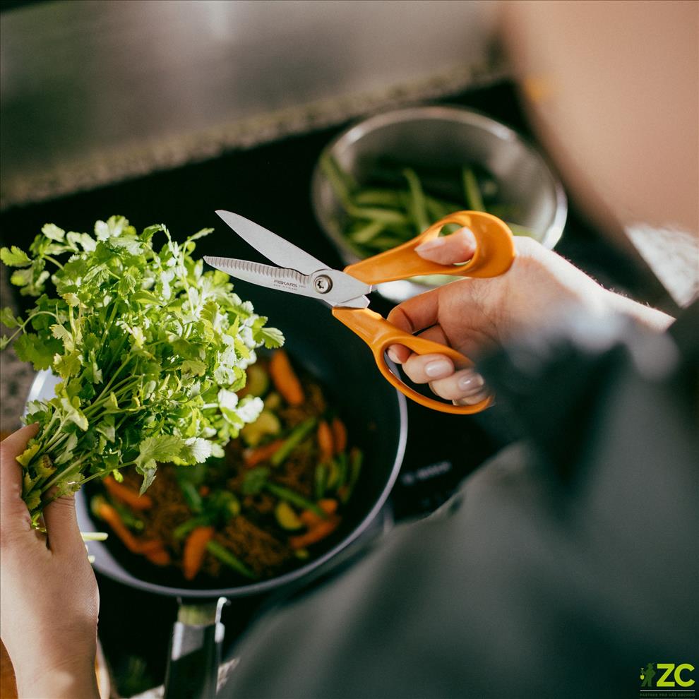 Kuchyňské nůžky Fiskars jsou vhodné na stříhání masa i zeleniny. Mohou se použít i k otevírání balíčků v kuchyni.